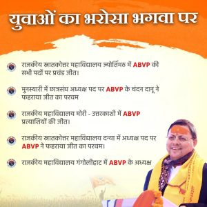 अखिल भारतीय विद्यार्थी परिषद (ABVP) को मिली बड़ी और ऐतिहासिक जीत ने स्पष्ट कर दिया कि प्रदेश के कॉलेज और विश्वविद्यालयों के छात्र, खासकर GenZ, भाजपा की विचारधारा और मुख्यमंत्री पुष्कर सिंह धामी के नेतृत्व वाली सरकार की नीतियों पर भरोसा रखते हैं। चुनाव परिणाम यह भी बताते हैं कि छात्रों के बीच सरकार के प्रति विश्वास की स्थिति विपक्ष के आरोपों से कहीं अलग है।